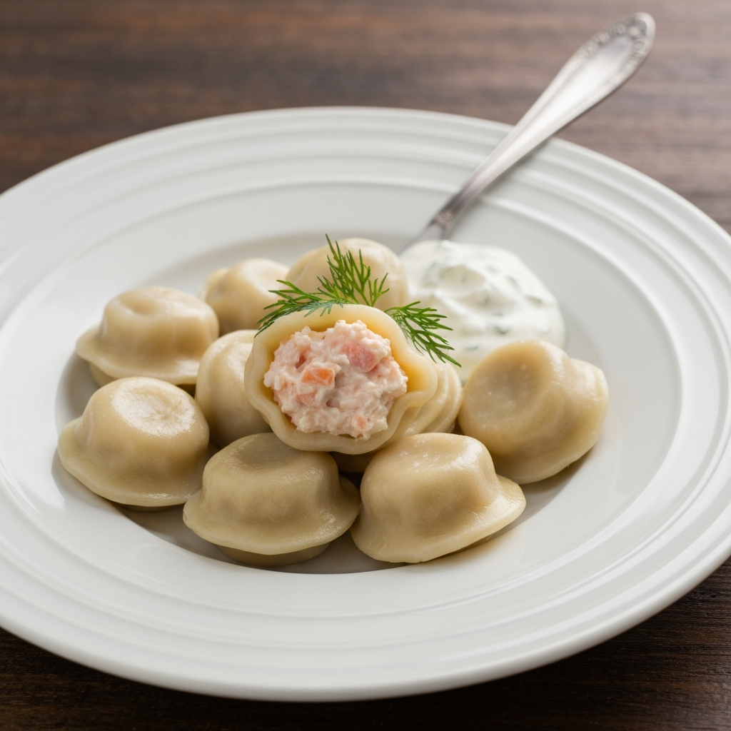 Siberian Pelmeni with Smoked Salmon and Dill Cream