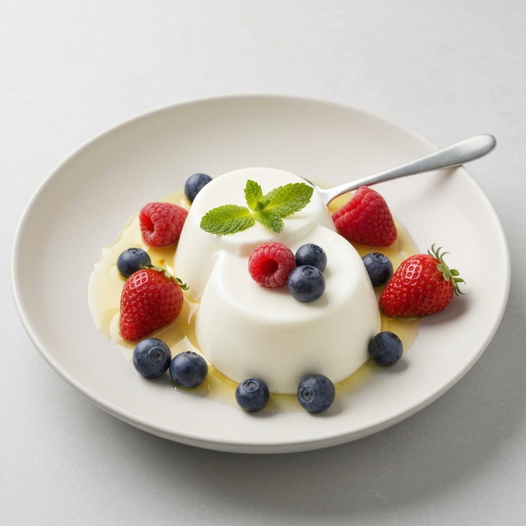 A light and airy panna cotta made with Greek yogurt, offering a refreshing and healthy end to the meal. The orange blossom water adds a subtle floral note that complements Mediterranean flavors, while the berries provide a burst of fresh sweetness.