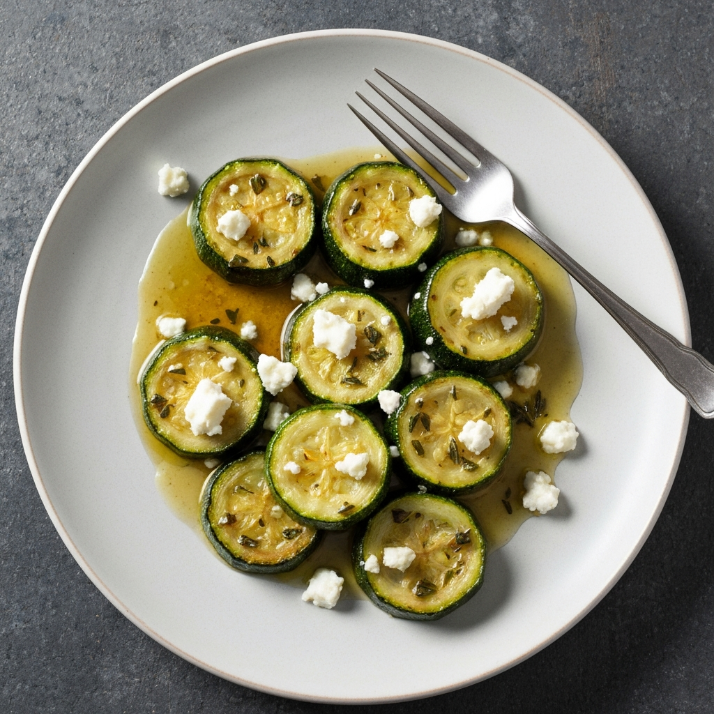 Tender, flavorful courgettes slow-cooked with herbs and garlic, topped with salty feta cheese. A light and delicious lunch option.