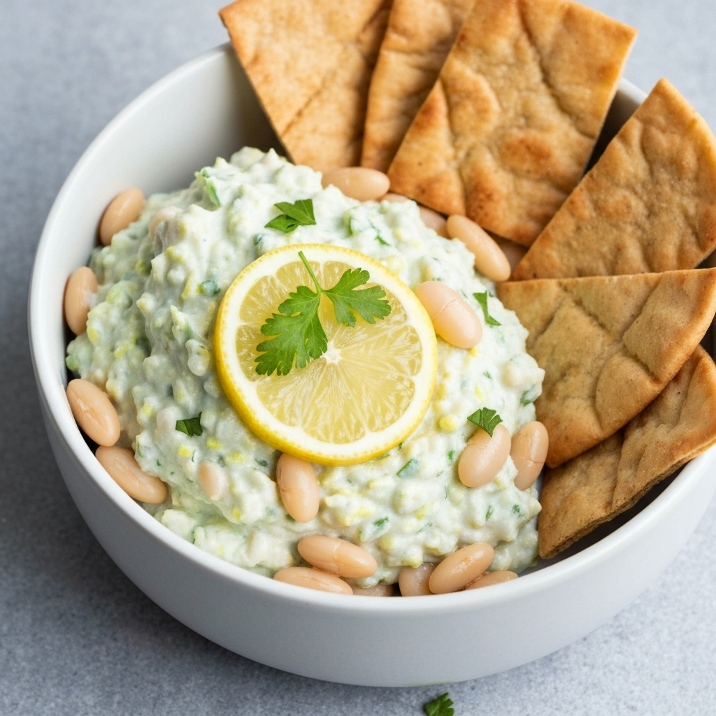 A bright and flavorful Mediterranean dip perfect as a starter. Creamy white beans are blended with lemon, garlic, and fresh herbs, served with toasted pita chips for a healthy and satisfying appetizer.