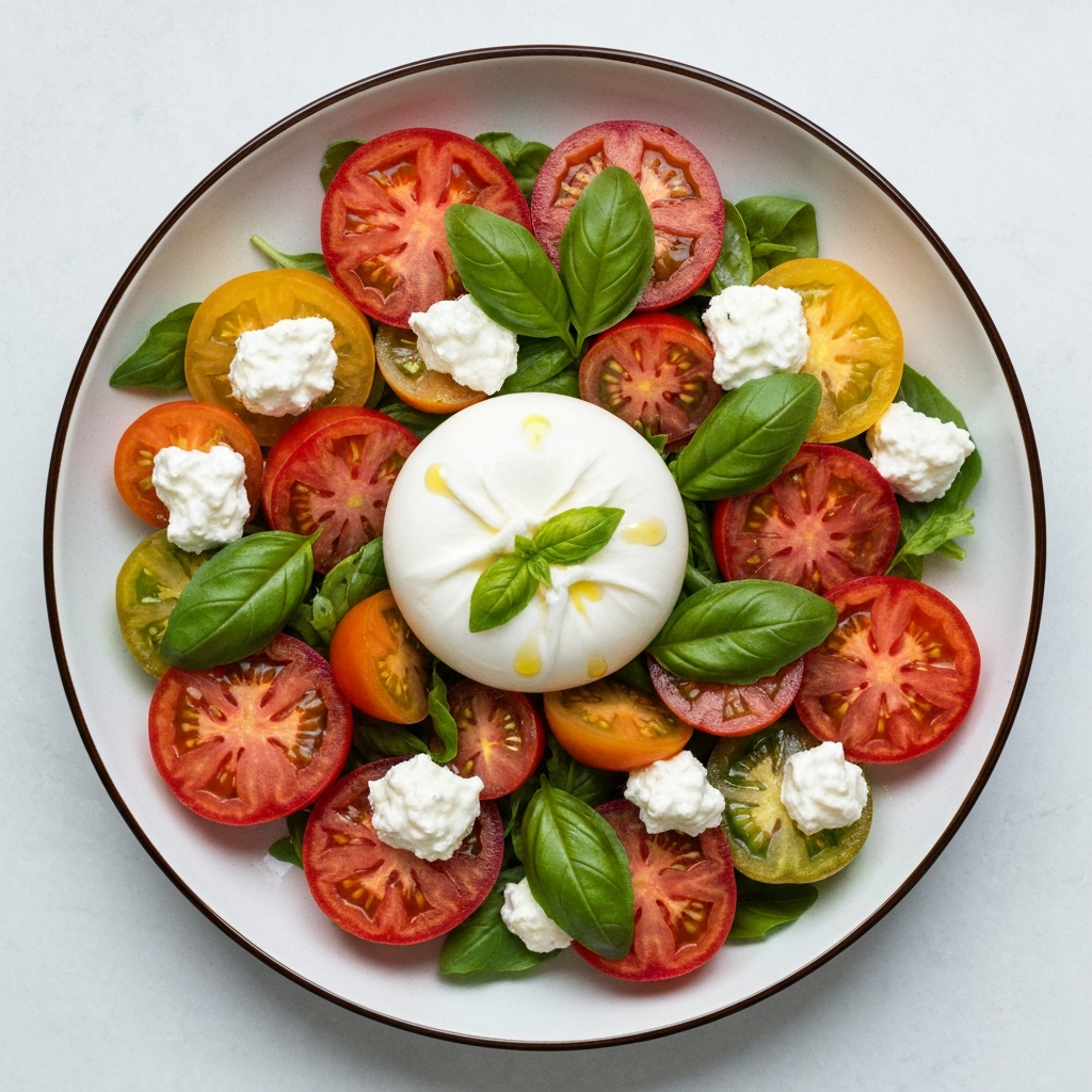 A light and refreshing salad featuring colorful heirloom tomatoes, creamy burrata, and a vibrant basil vinaigrette.
